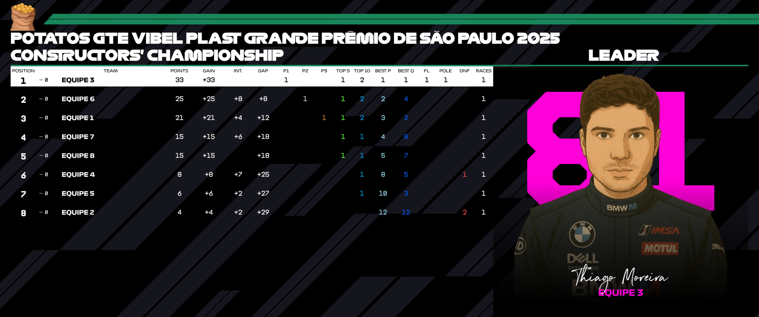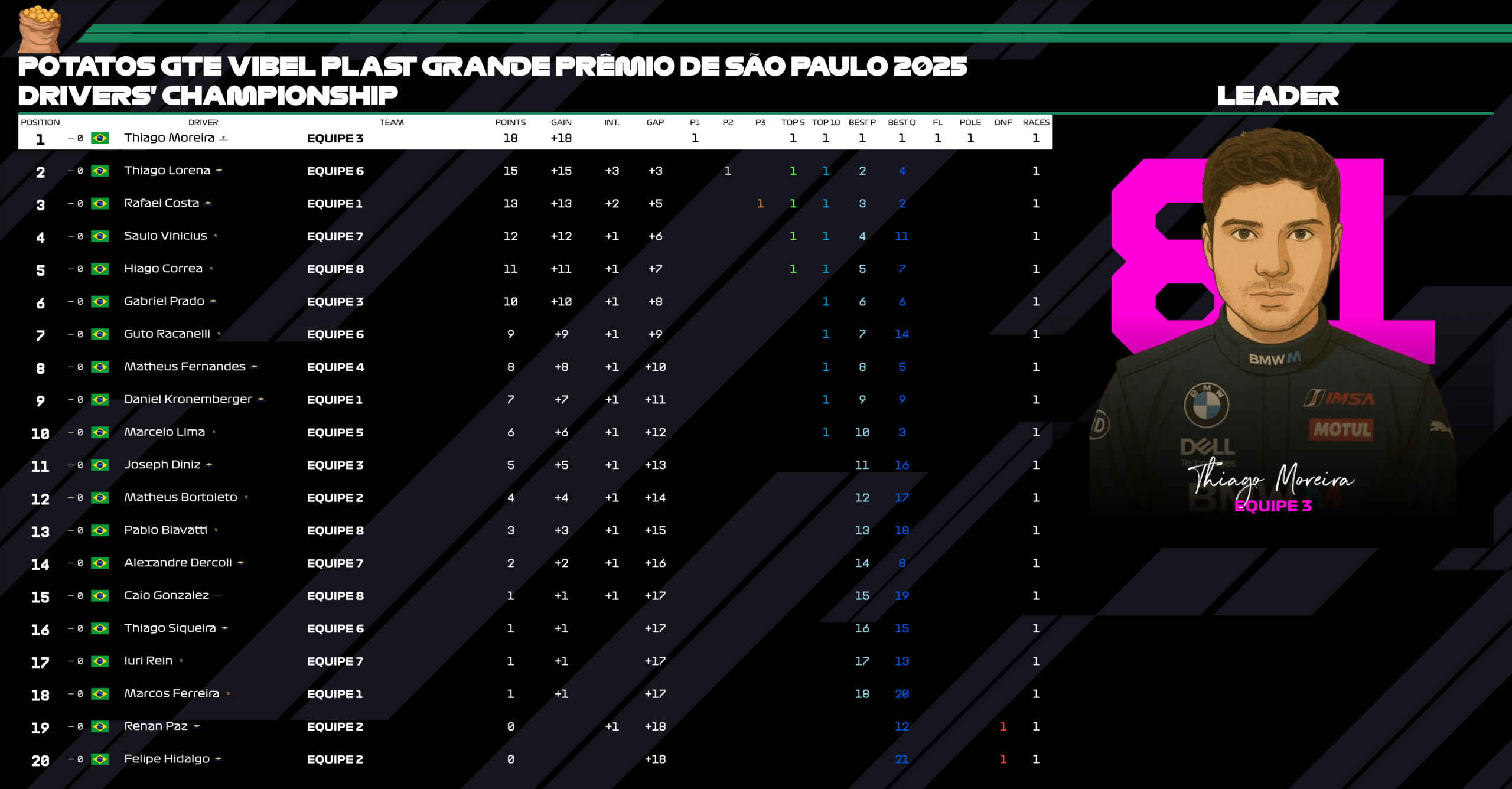 Entre os nomes que chamaram atenção, Gabriel Prado merece destaque. Em uma corrida de estreia na Potatos, o piloto mostrou regularidade, leitura de prova e maturidade, completando uma participação sólida e sem erros graves — um excelente cartão de visitas.