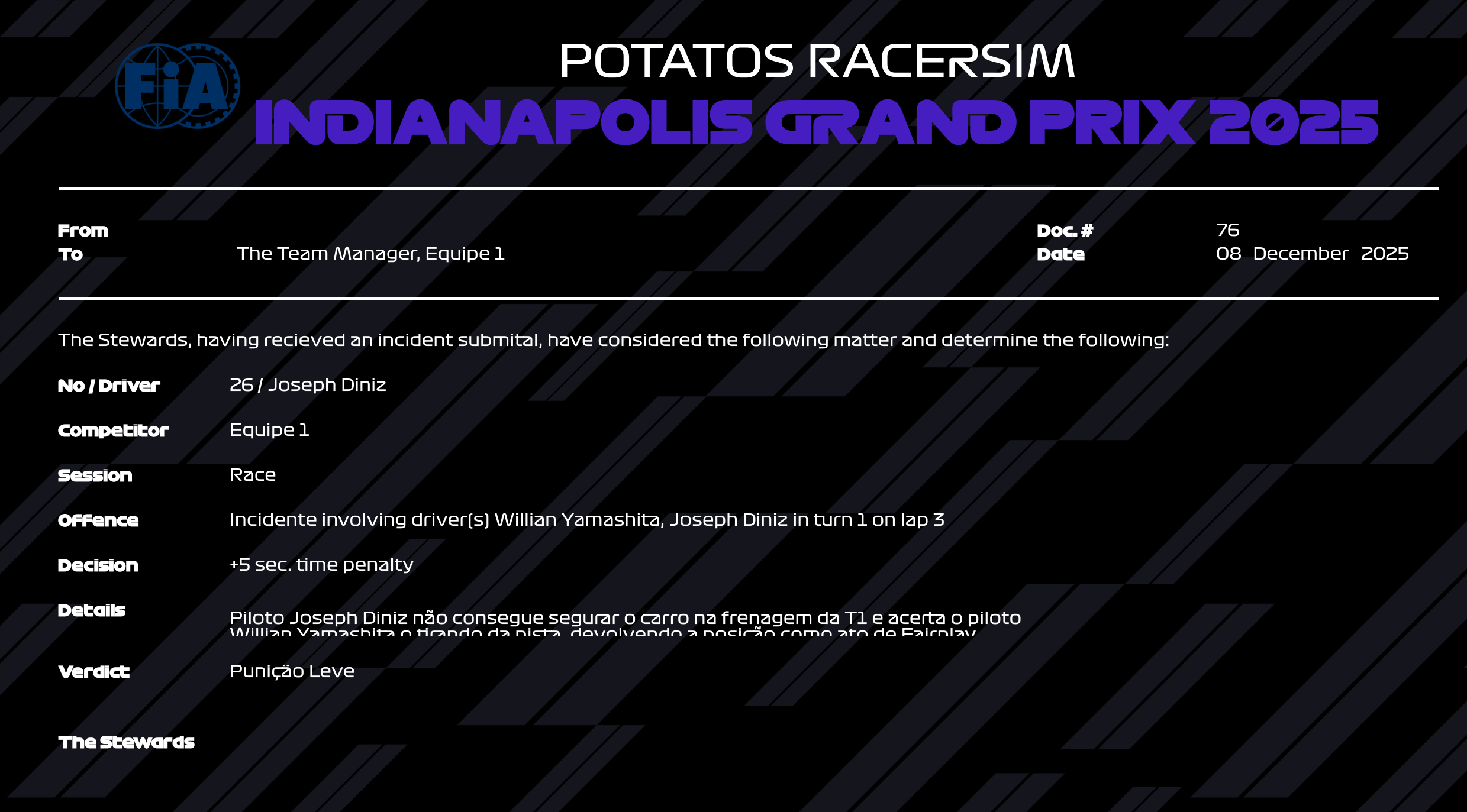 Joseph Diniz – (+5 Pontos na carteira LCP por etapas limpas Item 6.0 do regulamento da IMSA).