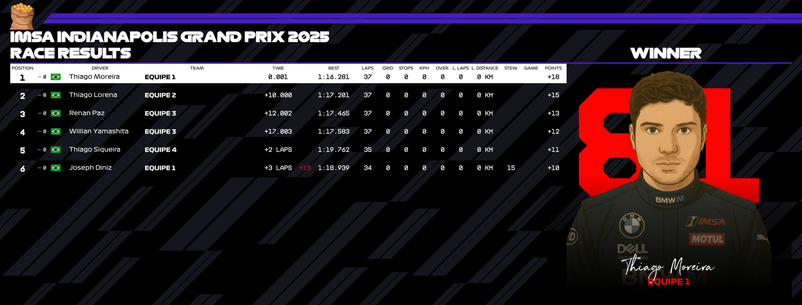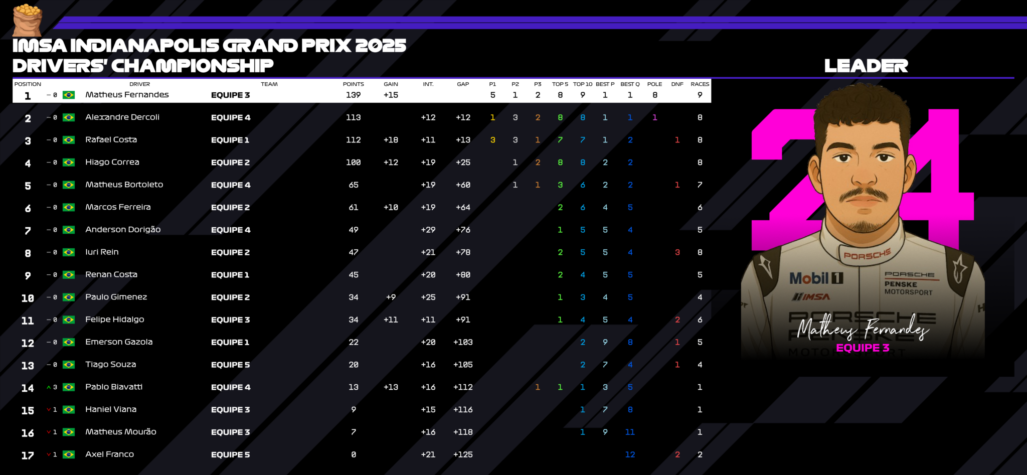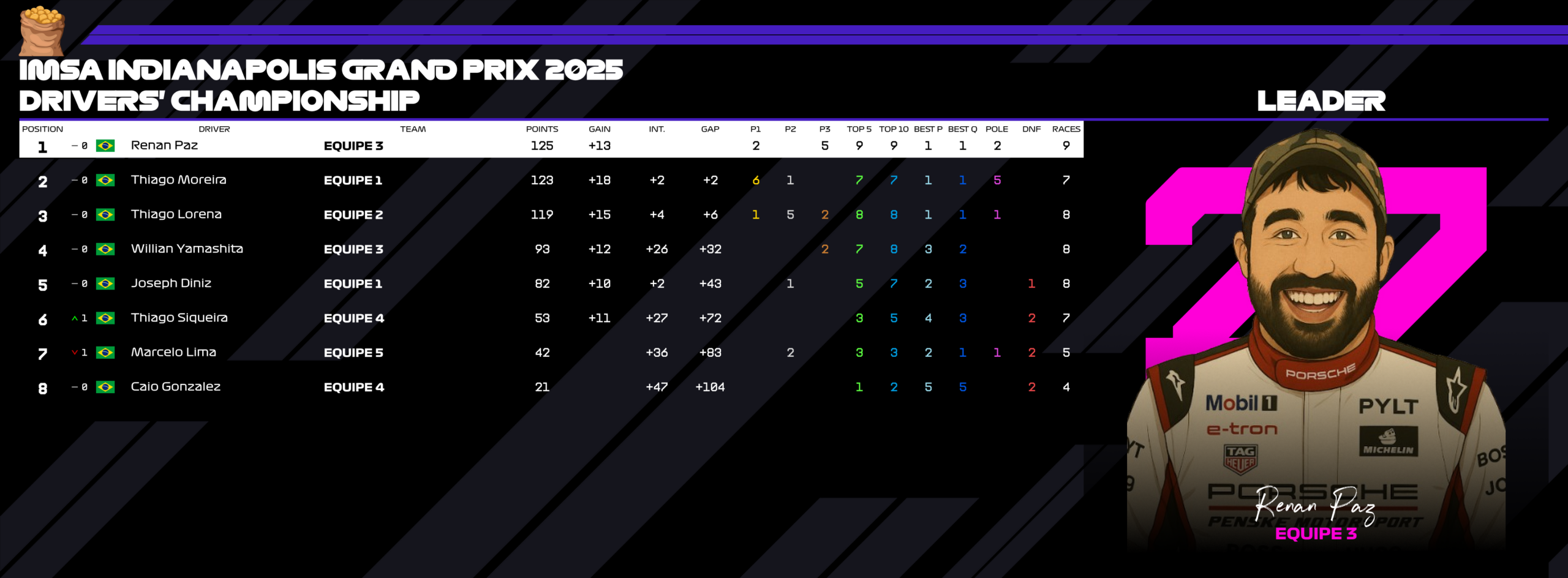Thiago Moreira venceu com autoridade, mostrando que ainda está muito vivo na briga pelo título. Rafael Costa triunfou na GT3, reacendendo completamente a disputa da categoria. Mateus Fernandes, mesmo sem vencer, saiu fortalecido — talvez mais líder do que nunca.